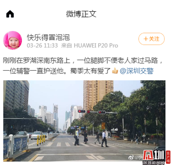 隨后,湊巧看到這一幕的網(wǎng)友將輔警護送老人過馬路的照片在微博上發(fā)布并配文:“剛剛在羅湖深南東路上,一位腿腳不便的老人家過馬路,一位輔警一直護著他。蜀黍太有愛了“。路過的行人也對交警這一暖心的小舉動贊不絕口,大家紛紛贊揚羅湖交警是暖心正能量。