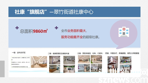 2021年3月,全市業(yè)務(wù)面積最大、服務(wù)功能最齊全的羅湖醫(yī)院集團(tuán)翠竹街道社康中心投入使用。總面積9860平方米共有4層,分設(shè)不同功能區(qū)。一樓為診療區(qū),涵蓋全科診療區(qū)、專家工作室、醫(yī)學(xué)影像檢查區(qū)等;二樓為健康管理區(qū),為居民提供全周期的健康體檢及檢后健康管理服務(wù),還設(shè)有超聲、檢驗(yàn)、DR等科室;三樓為預(yù)防保健區(qū),口腔科、婦科,四樓為高危兒早期康復(fù)中心、名中醫(yī)館、中醫(yī)康復(fù)理療區(qū)。
