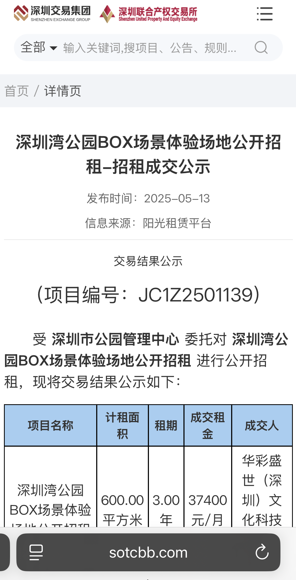 記者在深圳市城市管理和綜合執(zhí)法局官網(wǎng)未檢索到“深圳灣公園BOX項目”相關(guān)信息。但在深圳市聯(lián)合產(chǎn)權(quán)交易所網(wǎng)站發(fā)現(xiàn)一條公告,顯示“受深圳市公園管理中心委托,對深圳灣公園BOX場景體驗場地公開招租”,明確該項目由市公園管理中心負(fù)責(zé)。公開信息顯示,該項目計租面積600平方米,租期3年,成交金額為37400元/月。市民質(zhì)疑該租金水平遠(yuǎn)低于市場價,擔(dān)憂項目招標(biāo)的公平性,并希望了解租金去向:“租金是否歸入公園?是否存在收支兩條線?租金最終用到了哪里?均未見公開文件或說明?!?/p>