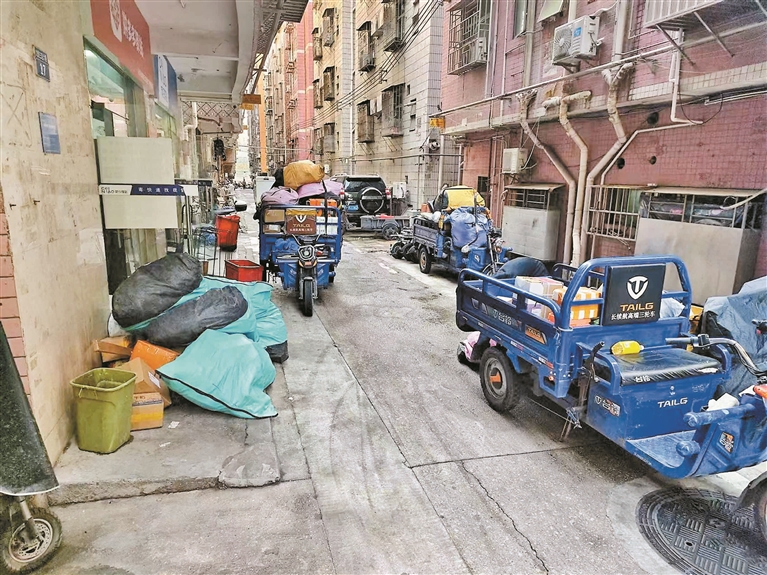 接到報料后,深晚記者于11月26日前往現場,進行了實地走訪調查。該驛站位于三聯村居民區(qū)深處,門面不大,還未走近,便能看到驛站門口的人行通道和部分公共區(qū)域已被大大小小的快遞包裹和快遞運送車“占領”,使得本來就僅能勉強供車輛通行的巷子變得更加狹窄。