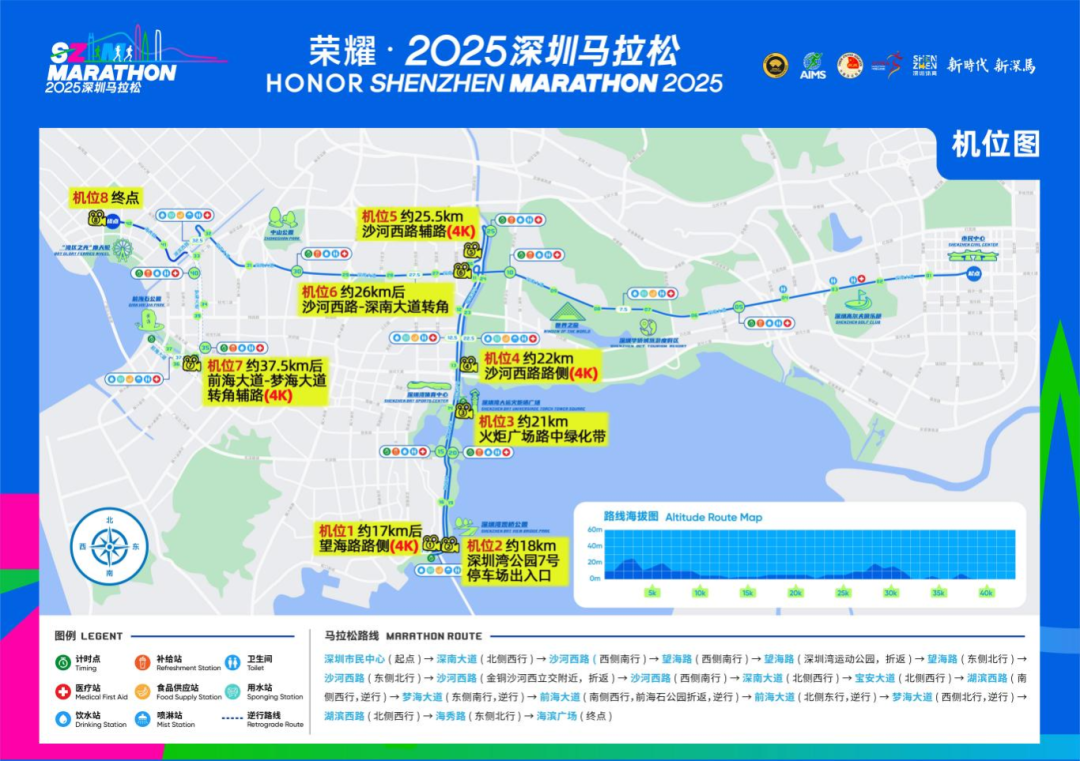 賽道全程42.195公里,串聯(lián)起深圳極具代表性的城市景觀。參賽選手從市民中心出發(fā),跑過風景優(yōu)美的深南大道、海風拂面的望海路、創(chuàng)新活力的前海大道,最后在寶安區(qū)海濱廣場終點沖線。