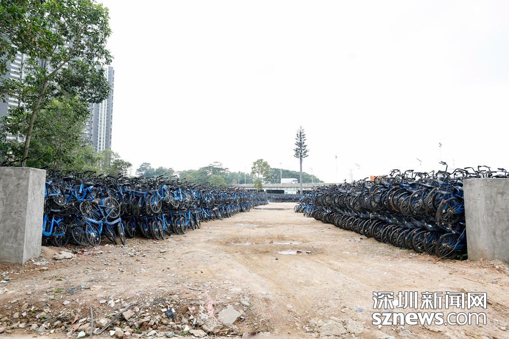 大量的小藍(lán)單車堆放在龍崗區(qū)水官高速旁的空地