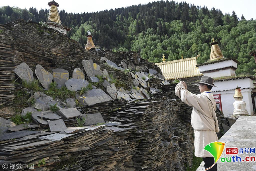 在四川阿壩州壤塘縣棒托寺內(nèi)珍藏約50萬片明清時期鐫刻的大藏經(jīng)《甘珠爾》和《丹珠爾》,大藏經(jīng)左高9.7米,右高9.2米,長46米、左寬160米,右寬13米,占地598平方米,是目前全世界保存最完整、規(guī)模最宏大、內(nèi)容最豐富的石刻大藏經(jīng)孤品。據(jù)史料記載,由明末清初60余名石匠辛勤鐫刻9年而成。石刻藏文經(jīng)書圖文并茂,筆法流暢,疏密有致,陰陽相背,滿版生輝。具有極高的文物和藝術研究價值。圖為堆積的石刻大藏經(jīng)孤品。圖片作者/視覺中國