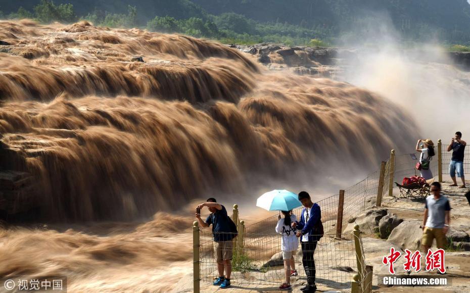 7月17日,山西臨汾,游客在黃河壺口瀑布游覽觀瀑。進(jìn)入7月主汛期,受黃河上游降雨量增多影響,位于山西吉縣和陜西宜川縣交界的黃河壺口瀑布水量暴漲。濁浪滔天的壯美瀑布群景觀,吸引了眾多游客。呂桂明攝 圖片來源:視覺中國