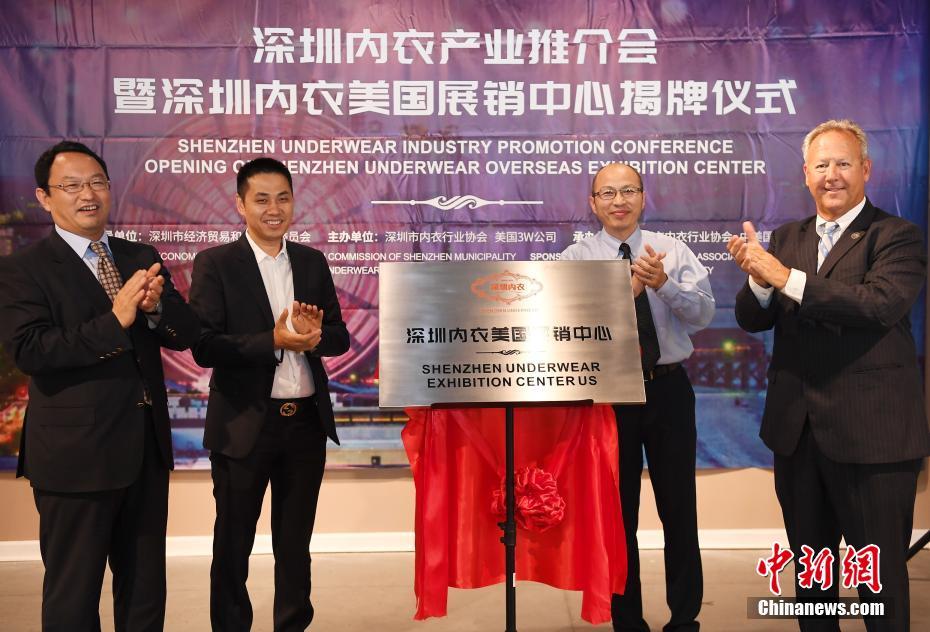 當(dāng)?shù)貢r(shí)間7月17日,深圳市內(nèi)衣行業(yè)協(xié)會(huì)在中美國際(美東)創(chuàng)業(yè)港——默特爾比奇市Waccoma Center舉行深圳內(nèi)衣產(chǎn)業(yè)推介會(huì)暨深圳內(nèi)衣美國展銷中心揭牌儀式。中美國際(美東)創(chuàng)業(yè)港聯(lián)合深圳市內(nèi)衣行業(yè)協(xié)會(huì)為深圳內(nèi)衣品牌進(jìn)駐美東市場搭建綠色通道和產(chǎn)業(yè)孵化平臺(tái),采用“時(shí)尚秀+靜態(tài)展”的形式,促進(jìn)中美內(nèi)衣文化和時(shí)尚的交流。圖為霍里郡議會(huì)主席馬克先生Mark Lazrus(右一)、深圳市經(jīng)濟(jì)貿(mào)易和信息化委員會(huì)副主任高林(左一)、美國3W公司董事長王為工(右二)、深圳市內(nèi)衣行業(yè)協(xié)會(huì)常務(wù)副會(huì)長兼秘書長張峰偉(左二)出席揭牌儀式。中新社記者 陳文 攝