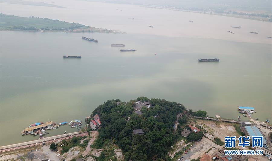 長江和鄱陽湖在江西省九江市湖口縣石鐘山附近交匯,形成江湖兩色美景(8月5日無人機(jī)拍攝)。 新華社記者 金立旺 攝
