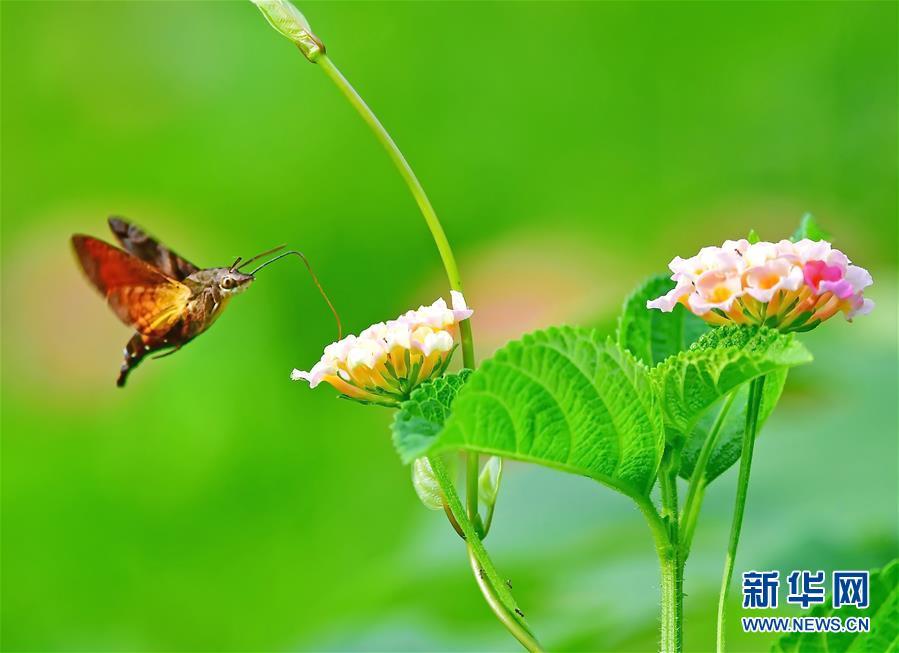 在福建省福州市溫泉公園,透翅天蛾在花間飛舞(8月18日攝)。近日,福建省福州市溫泉公園內(nèi)的馬纓丹大面積開放。花紅、草綠、蟲飛,構(gòu)成了一幅和諧的閩都生態(tài)圖景。 新華社記者梅永存攝