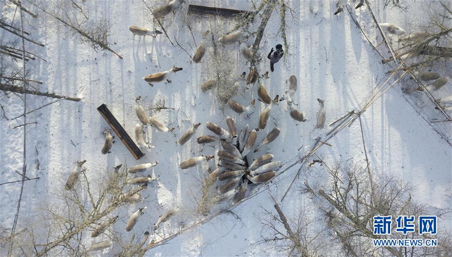 在內(nèi)蒙古大興安嶺根河林業(yè)局約安里林場(chǎng),林場(chǎng)職工張國華在鹿圈補(bǔ)充飼料(2017年12月23日無人機(jī)拍攝)。新華社記者李任滋攝