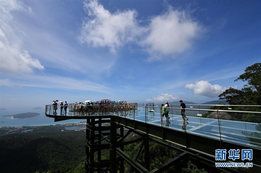 8月31日,游客在玻璃棧道上參觀(guān)游覽。近日,位于海南省三亞市亞龍灣熱帶天堂森林公園的大佛石全海景玻璃棧道開(kāi)始正式營(yíng)業(yè)。凌空而建的玻璃棧道全長(zhǎng)400米,游客可將亞龍灣的美景盡收眼底。新華社記者郭程攝