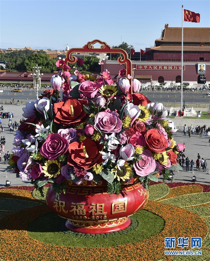 當日,“祝福祖國”巨型花籃在北京天安門廣場全面亮相。據(jù)了解,從2011年開始,“祝福祖國”巨型花籃一直作為天安門廣場中心花壇的主景在國慶節(jié)期間向祖國獻禮。今年花籃內布置有紅掌、梅花、康乃馨、向日葵、蘭花、月季等多種仿真花卉,寓意幸福吉祥。 新華社記者 李賀 攝