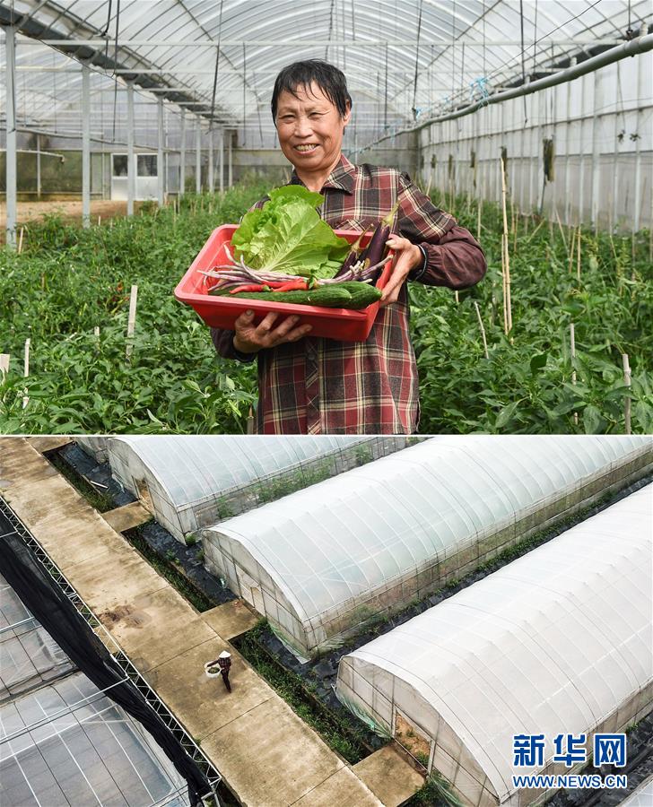 這張拼版照片顯示的是:上圖,9月20日,在江蘇省常州市鐘樓區(qū)鐘樓現(xiàn)代農(nóng)業(yè)產(chǎn)業(yè)園,菜農(nóng)邵新華展示剛采摘的蔬菜;下圖,9月20日,菜農(nóng)邵新華在農(nóng)業(yè)產(chǎn)業(yè)園的大棚旁搬運蔬菜(無人機拍攝)。 新華社記者李博攝