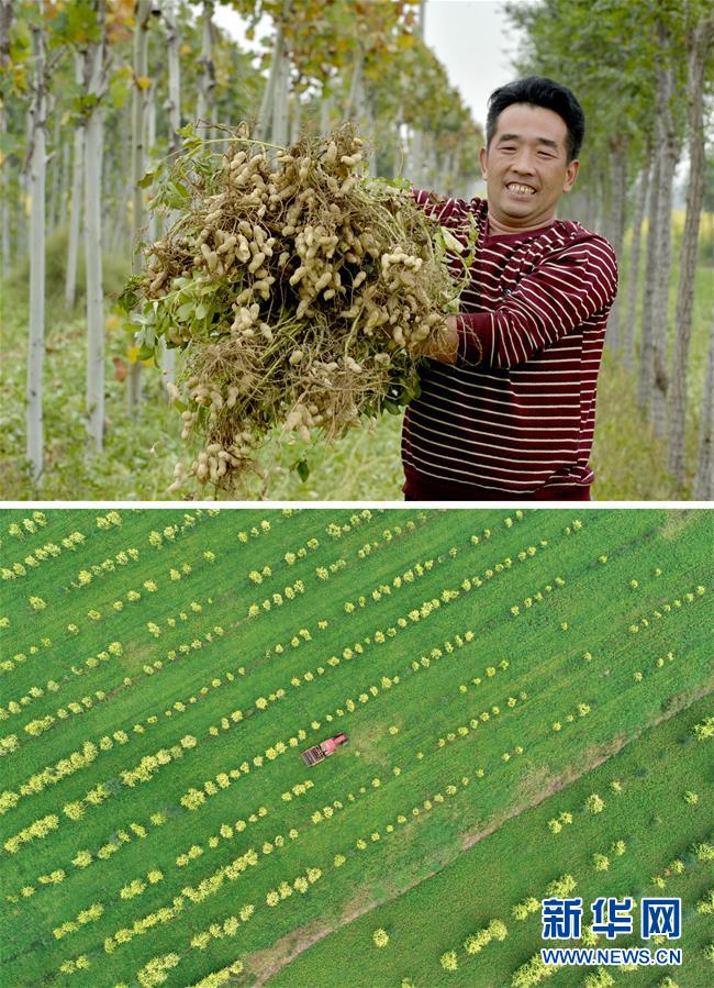 這張拼版照片顯示的是:上圖,9月18日,河北邢臺經(jīng)濟開發(fā)區(qū)郭龍莊村農(nóng)民王路坤展示收獲的花生;下圖,9月18日,王路坤駕駛農(nóng)機收獲花生(無人機拍攝)。 新華社記者牟宇攝
