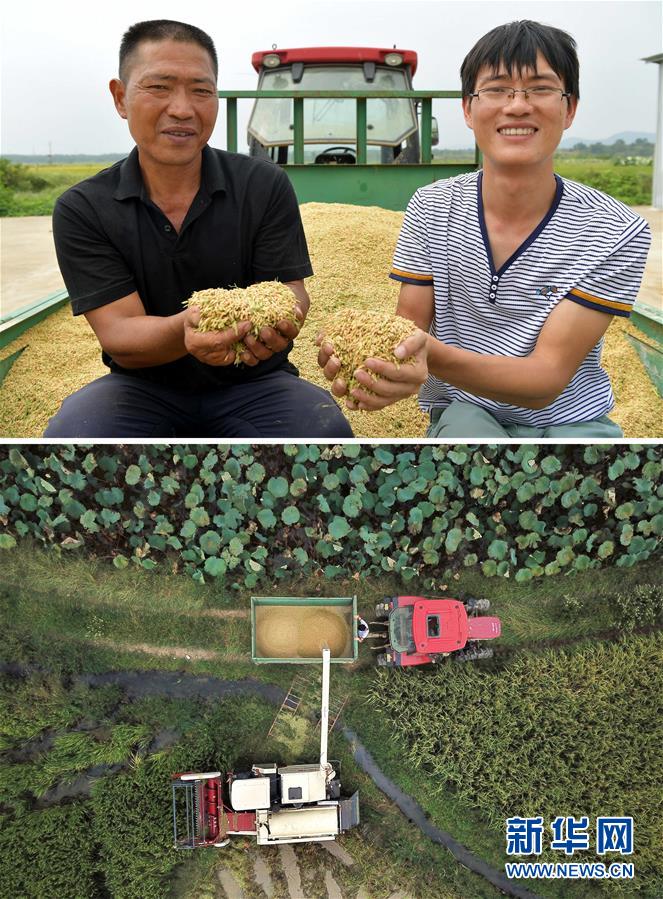 這張拼版照片顯示的是:上圖,9月21日,在江西省南昌市新建區(qū)留田村,種糧大戶周小林(左)、周標(biāo)父子展示收獲的稻谷;下圖,9月21日,周小林、周標(biāo)父子操作農(nóng)機收割中稻,同時將稻谷裝入拖拉機(無人機拍攝)。 新華社記者彭昭之?dāng)z