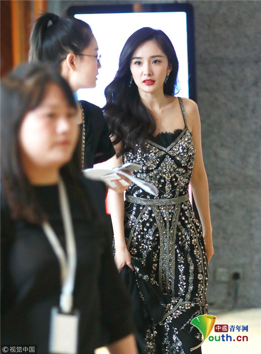 楊冪卷發(fā)成熟美露香肩 自提裙擺過(guò)酒店大堂