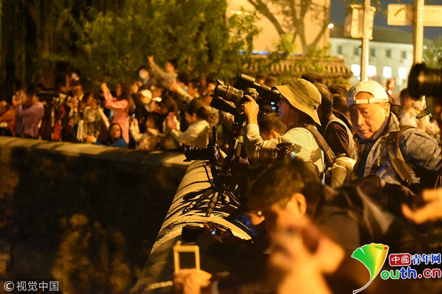 市民和攝影愛(ài)好者聚集故宮角樓下拍攝月亮。
