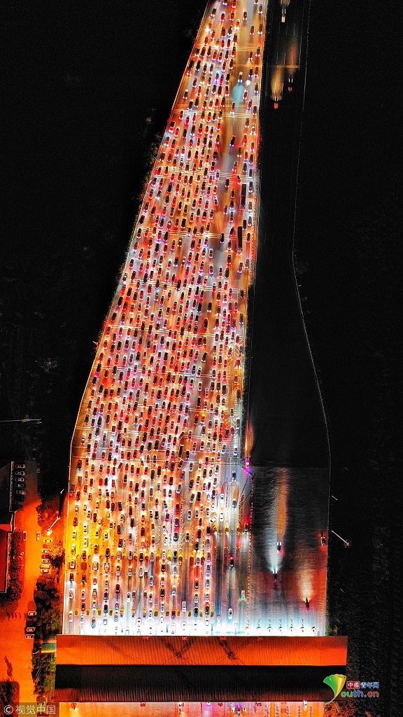 從天上鳥(niǎo)瞰,車(chē)輛的尾燈宛若一條紅色的巨龍,望不到盡頭,場(chǎng)面十分壯觀。