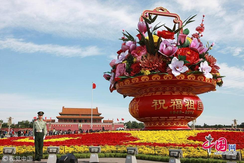 昨天,不少游客在天安門廣場前駐足拍照。經(jīng)過一周多時間的日夜奮戰(zhàn),“祝福祖國”巨型花籃組裝完成。北京青年報(bào)從市園林綠化局獲悉,自2011年開始,“祝福祖國”巨型花籃就一直作為廣場中心花壇,在國慶節(jié)期間向祖國獻(xiàn)禮。今年花籃為鋼架結(jié)構(gòu),籃身為玻璃鋼材質(zhì),可抗10級風(fēng)?;@體南側(cè)書寫“祝福祖國,1949-2018”,籃體北側(cè)書寫“歡度國慶,1949-2018”。