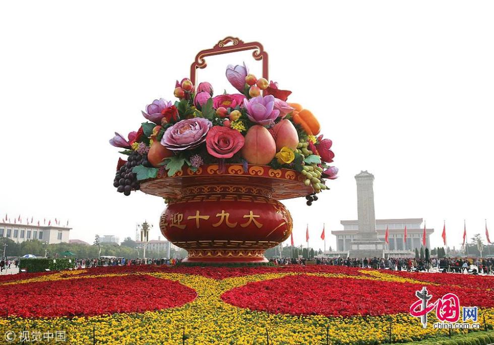 2017年天安門廣場大花籃以喜慶的花果籃為主景,花籃頂高17米,籃體高15.3米,底部直徑達(dá)50米?;@體南側(cè)寫有“祝福祖國、1949-2017”,北側(cè)寫有“喜迎十九大” 字樣?;ü@內(nèi)共使用主花56朵(牡丹、月季、玉蘭、金桂、迎春花、蘋果花、紫藤花、文心蘭、葉子花),其中最大牡丹直徑3.2米,果實(shí)6種(石榴、桃、柿子、蘋果、海棠、葡萄)。寓意吉祥的果實(shí)和花卉,象征十八大以來,黨和國家在各個領(lǐng)域取得的輝煌成就,碩果累累。底部花壇采用心形圖案,寓意紅心向黨,象征著全國人民緊密團(tuán)結(jié)在以習(xí)近平同志為核心的黨中央周圍,表達(dá)對祖國繁榮富強(qiáng)、欣欣向榮的美好祝福。