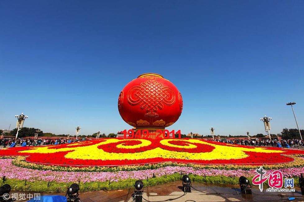 2011年10月04日,在北京蔚藍(lán)的天空下,“祝福祖國”的大型花壇屹立在天安門廣場中央。蘇陽攝影