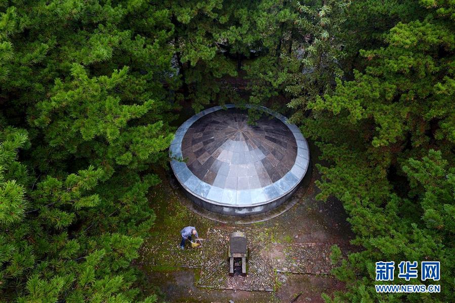 趙乃堂在黃崖洞烈士陵園內(nèi)打掃(9月19日無人機拍攝)。 新華社記者 詹彥 攝