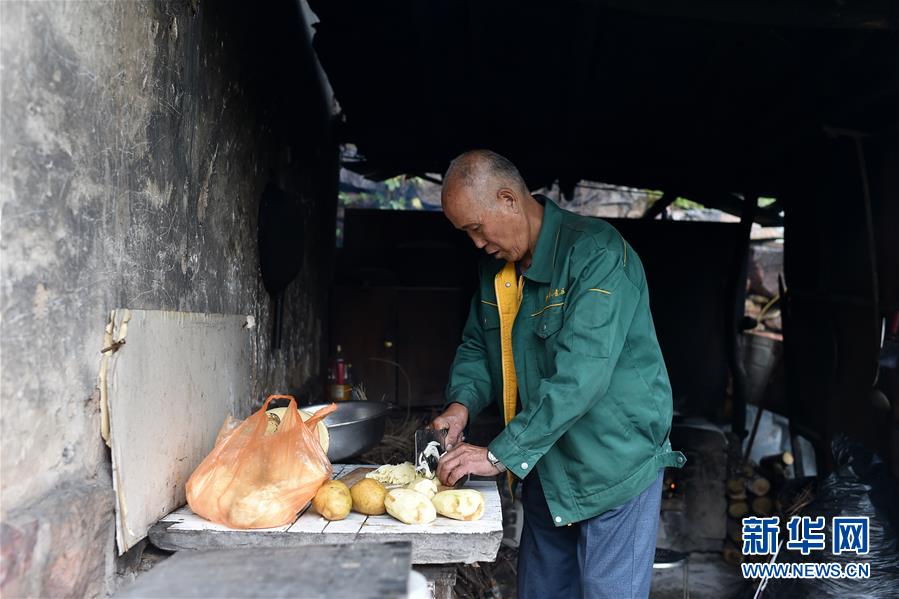 在黃崖洞烈士陵園,趙乃堂在屋里吃午飯(9月18日攝)。 新華社記者 詹彥 攝