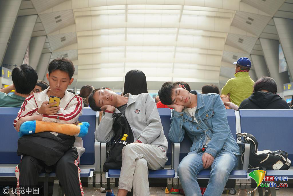 2018年10月1日,兩名旅客在北京南站內(nèi)候車時(shí)打盹。當(dāng)天是國(guó)慶假期首日,北京南站迎來(lái)客流高峰。此前,據(jù)北京鐵路局預(yù)計(jì),國(guó)慶黃金周將發(fā)送旅客1168萬(wàn)人,同比增加19.9萬(wàn)人。其中10月1日為出行高峰日,預(yù)計(jì)當(dāng)天發(fā)送旅客143萬(wàn)人,同比增加4.7萬(wàn)人。圖片作者:張興龍