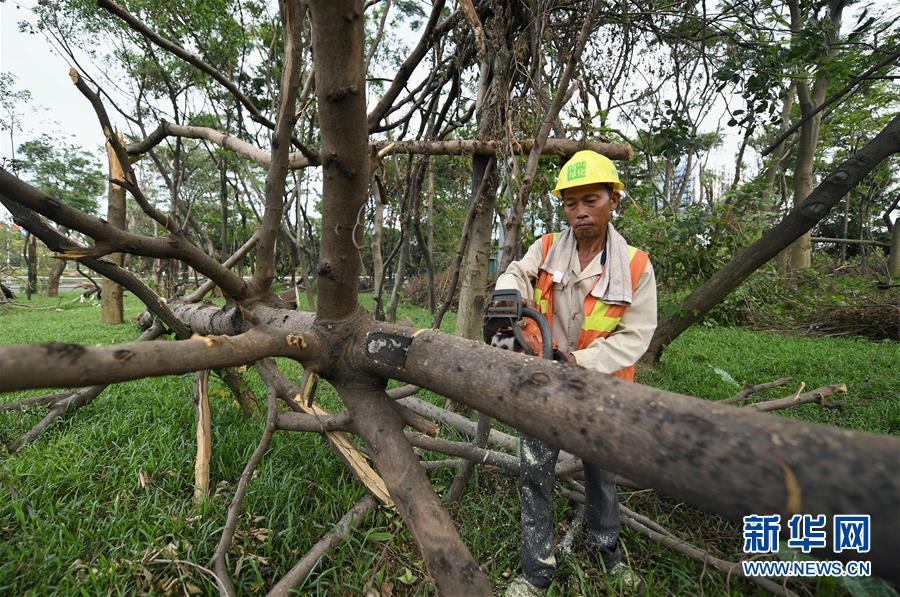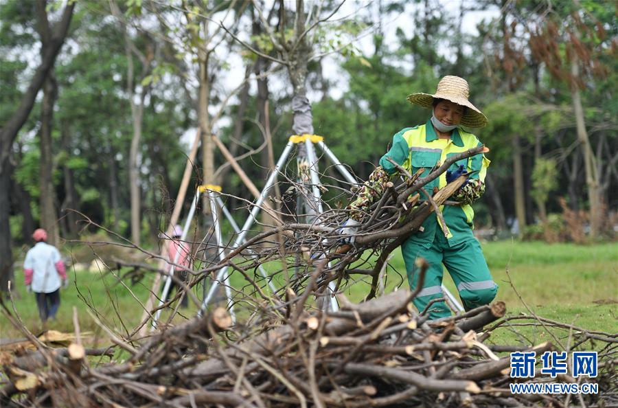 10月1日,工作人員在深圳街頭的綠化帶清理強(qiáng)臺風(fēng)“山竹”損毀的樹木。當(dāng)日是國慶節(jié),許多勞動者堅守在工作一線,在崗位上度過節(jié)日。新華社記者毛思倩攝