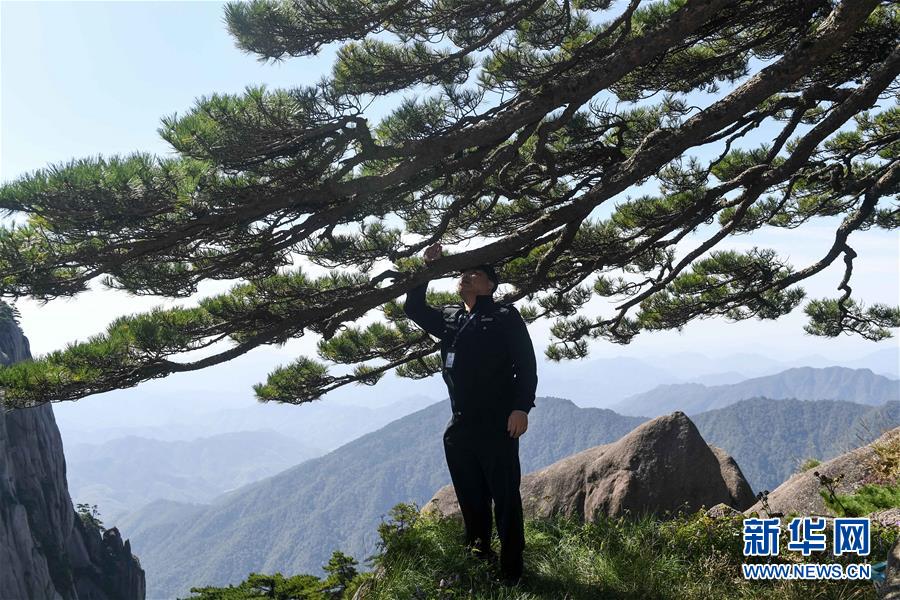 10月1日,安徽黃山風(fēng)景區(qū)管委會園林局迎客松專職守護(hù)人胡曉春在對迎客松進(jìn)行巡查。當(dāng)日是國慶節(jié),許多勞動者堅守在工作一線,在崗位上度過節(jié)日。新華社記者張端攝