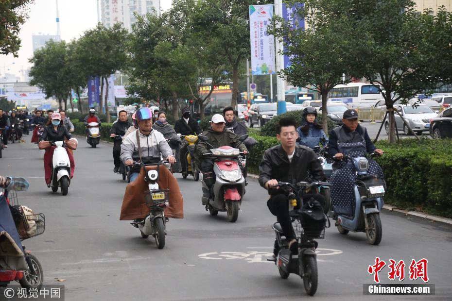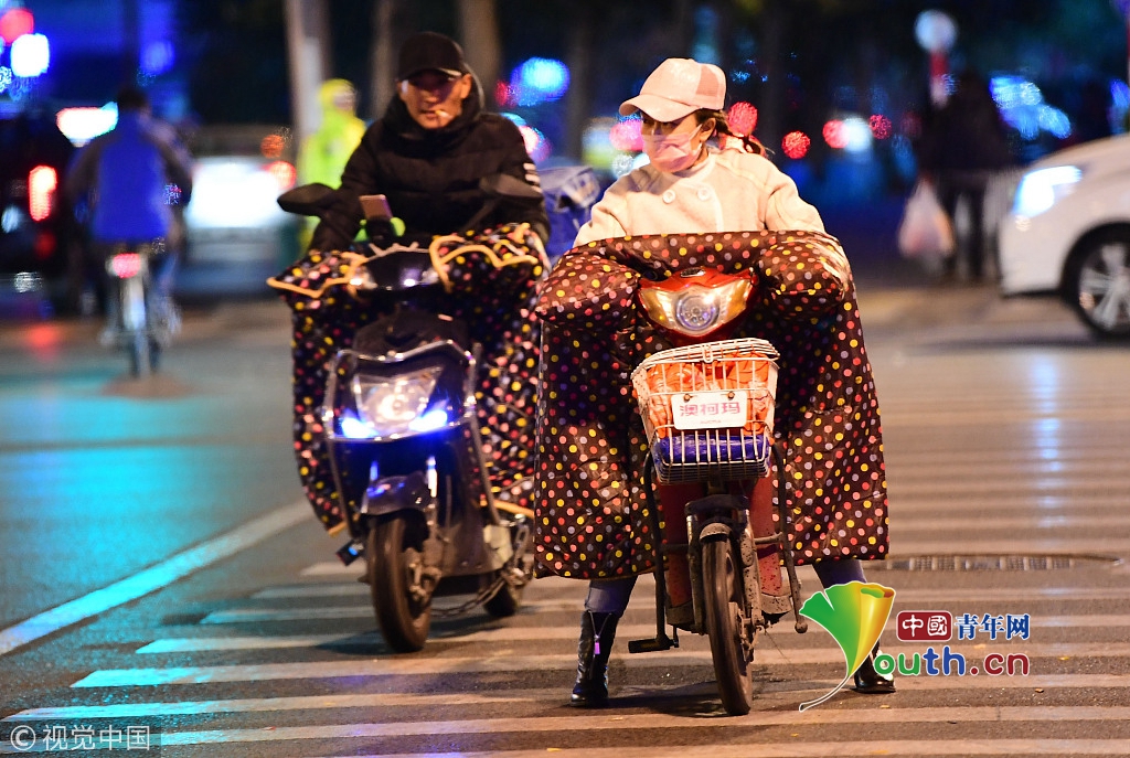 2018年10月9日,山東濟(jì)南,昨日一場(chǎng)秋雨過后開始降溫,今天清晨最低氣溫只有6度,馬路上不少上班族穿上羽絨服騎車趕上班路。 圖片來源:視覺中國(guó)