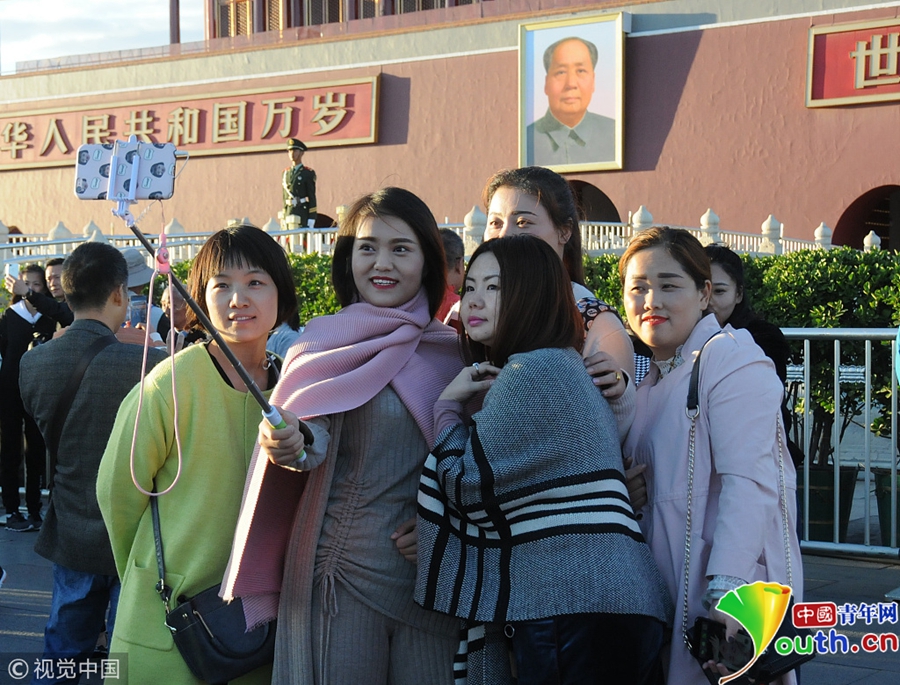 北京冷空氣來襲 游客紛紛著秋冬裝游覽天安門