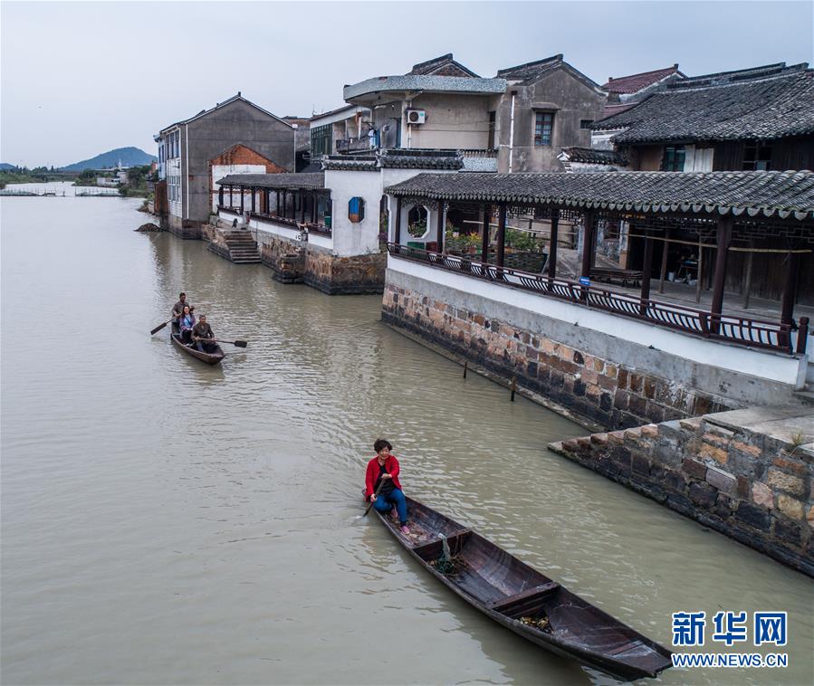 10月10日,泉家潭村村民劃著小船經(jīng)過沿河長(zhǎng)廊(無人機(jī)拍攝)。經(jīng)過改造提升后,沿河長(zhǎng)廊和整潔的古村街巷成為當(dāng)?shù)孛利愢l(xiāng)村的景觀帶。 新華社記者 徐昱