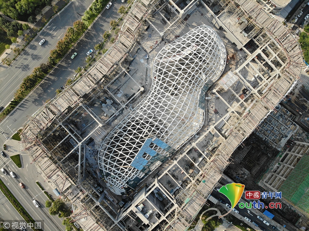2018年10月13日,河南鄭州,龍子湖湖心島上的一棟在建大樓頂部設(shè)計為鏤空的框架結(jié)構(gòu),俯瞰酷似一顆巨大的花生。