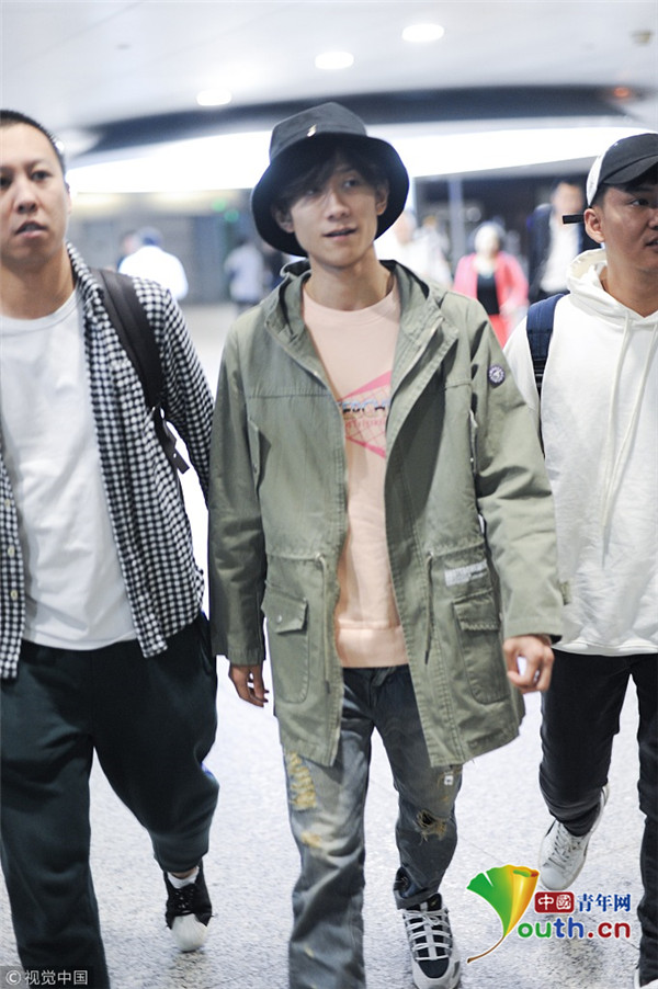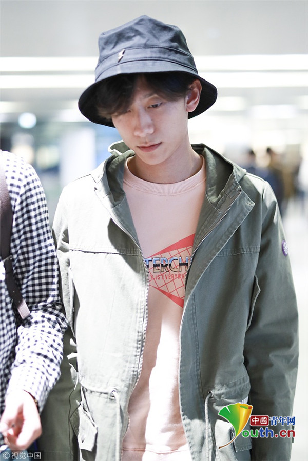 2018年10月14日,上海,張一山抵達(dá)上海機(jī)場。張一山戴漁夫帽眼袋嚴(yán)重瞬間老十歲, 用手擋臉?biāo)撇辉干乡R。