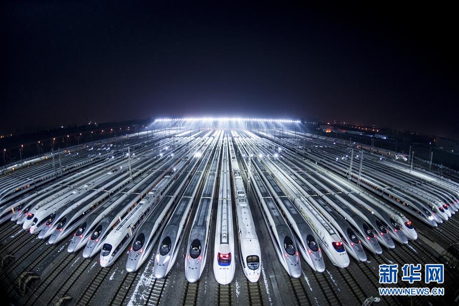 2018年2月1日凌晨,動車組停靠在武漢動車段的存車線上,準備進行檢修和保溫作業(yè)。近百組在武漢動車段經(jīng)過檢修、保溫作業(yè)的動車組蓄勢待發(fā),迎接春運。新華社記者 肖藝九 攝