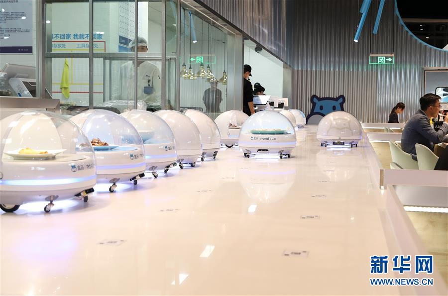 近日,一家由機器人充當送餐服務(wù)員的盒馬機器人餐廳現(xiàn)身上海國家會展中心,為顧客帶來一種用餐新選擇。