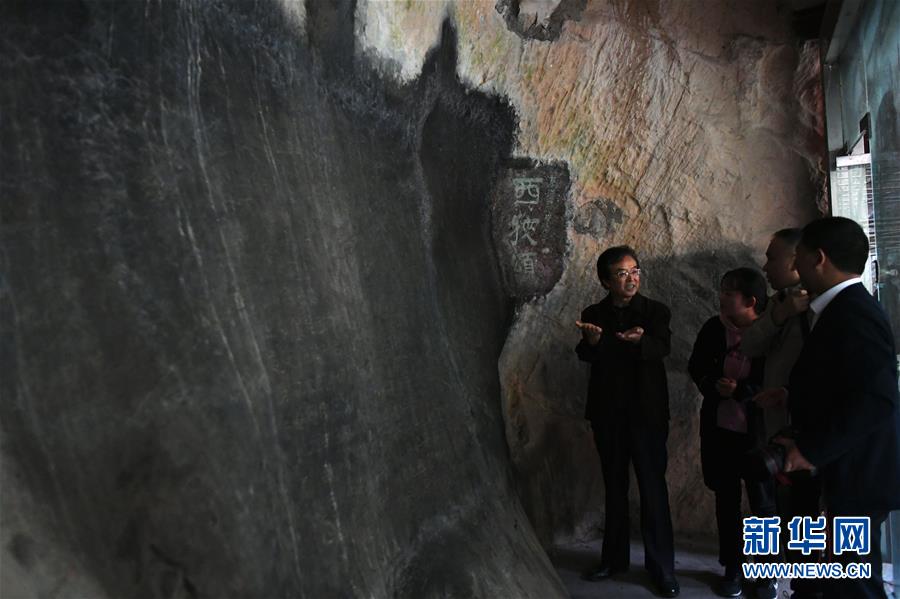 10月16日,成縣文物保護(hù)專家張建文(左一)向客人講解漢代摩崖石刻《西狹頌》。 新華社記者 陳斌 攝