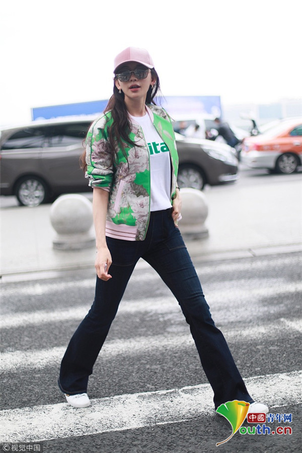 2018年10月16日,上海,林志玲亮相機場,她身穿綠色印花外套搭配粉色鴨舌帽十分清新靚麗,乖乖坐小車抿嘴甜笑比V嘟嘴頻賣萌。