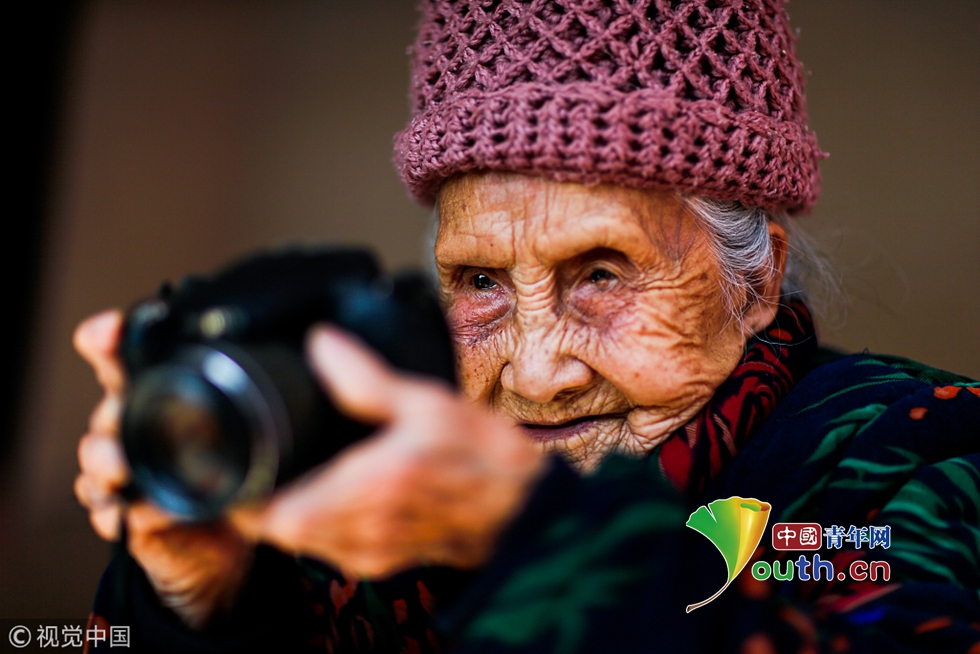 2017年03月02日,廣西壯族自治區(qū)桂林市恭城瑤族自治縣蓮花鎮(zhèn)蓮花街上,有一個(gè)慈眉善目的老人李玉珍,大家都親切地叫她“容伯娘”。她不僅是鎮(zhèn)上碩果僅存的兩位百歲老人之一,還是鎮(zhèn)上那個(gè)最老照相館的攝影師。老人拿起數(shù)碼相機(jī)拍攝照片的眼神依舊犀利。圖片作者:游擁軍/視覺中國(guó)