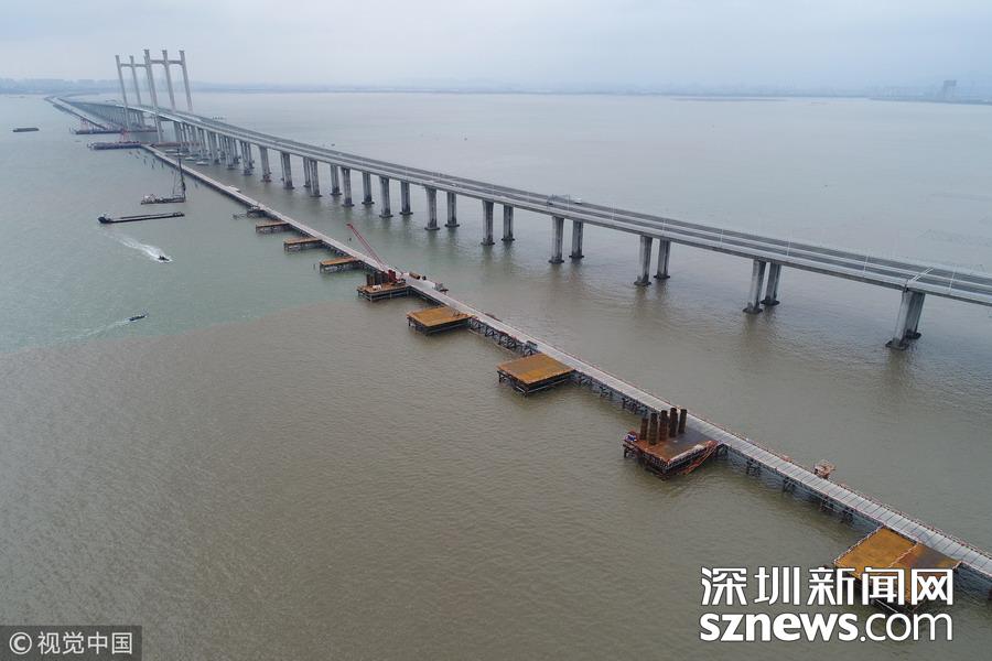 航拍福廈高鐵泉州灣跨海大橋施工正酣