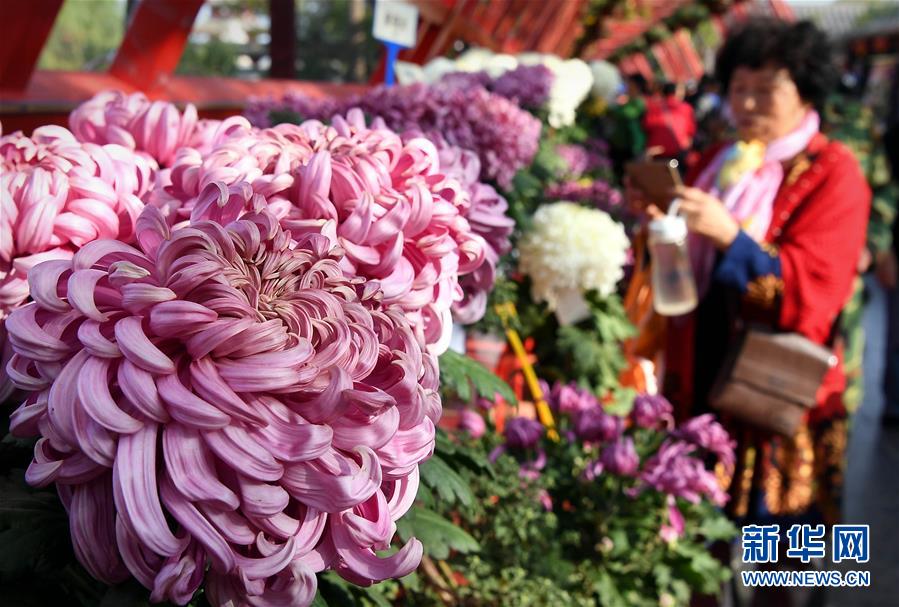 10月17日,游客在開封清明上河園觀賞菊花。重陽時節(jié),各色菊花競相綻放,把古都開封裝點得分外秀美,吸引眾多游客前來觀賞游玩。 新華社記者 李安 攝