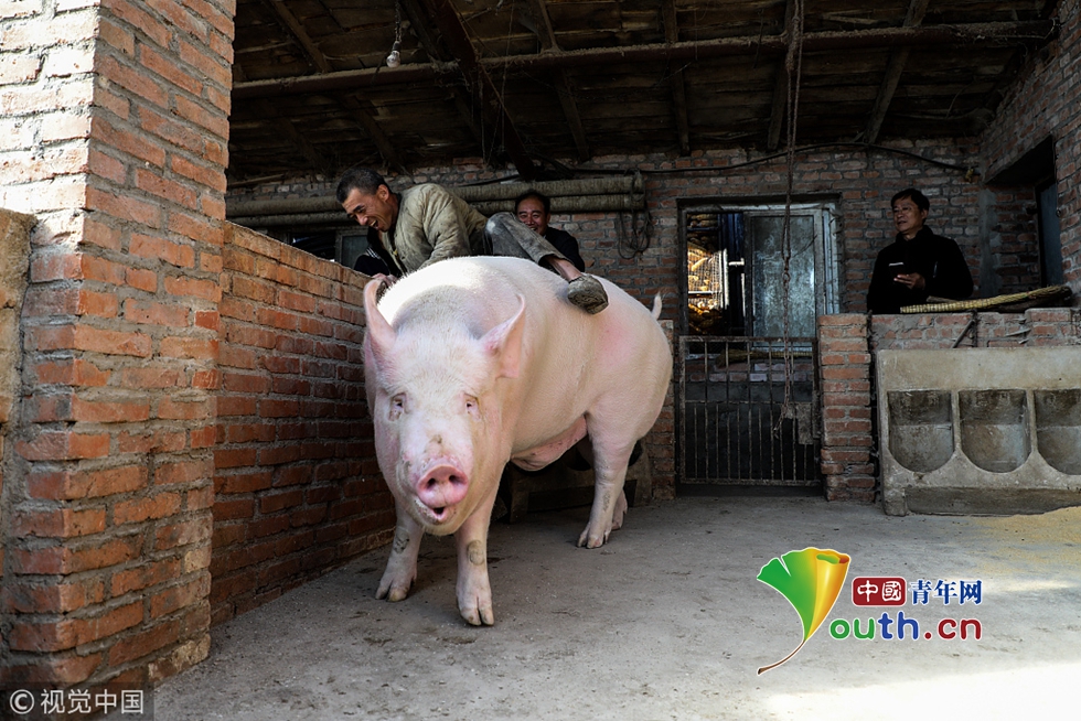 村里一位83歲的老人在圍觀時(shí)說(shuō),活了一輩子第一次見(jiàn)到這么大的豬,豬是好豬,但是賣不出去愁人啊。900斤大豬是個(gè)什么概念?體長(zhǎng)2米25、腰圍1米75,站立高度1米10。此時(shí)此刻,900斤大豬完全不知主人的苦,也完全不知道外面的世界發(fā)生了什么。圖為養(yǎng)豬戶張先生險(xiǎn)些從900斤大豬背上摔下來(lái)。圖片作者:棋簿紫/視覺(jué)中國(guó)