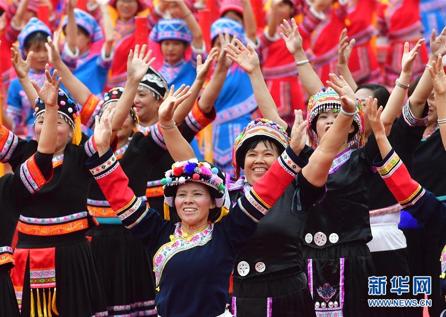 10月20日,各族同胞在廣西大化瑤族自治縣江濱文化廣場(chǎng)表演節(jié)目,慶??h慶。 新華社記者黃孝邦攝