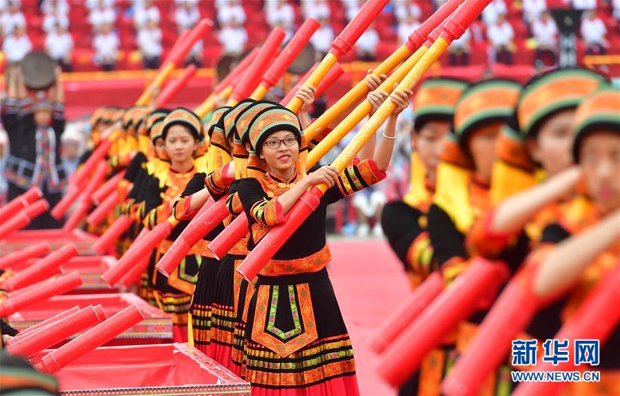 10月20日,各族同胞在廣西大化瑤族自治縣江濱文化廣場(chǎng)表演節(jié)目,慶??h慶?! ⌒氯A社記者陸波岸攝