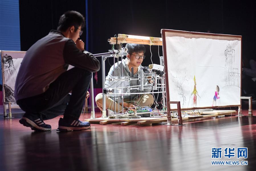 10月21日,在位于安徽合肥的中國科學(xué)技術(shù)大學(xué),“人五成影”隊帶著皮影戲機(jī)器人參加比賽。新華社記者張端攝