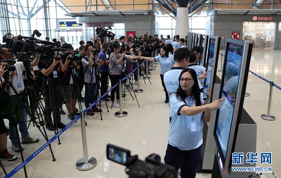 10月19日,在香港口岸旅檢大樓,工作人員在穿梭巴士自助售票機(jī)前演示購(gòu)票過(guò)程。 港珠澳大橋開(kāi)通在即。 新華社記者 李鋼 攝