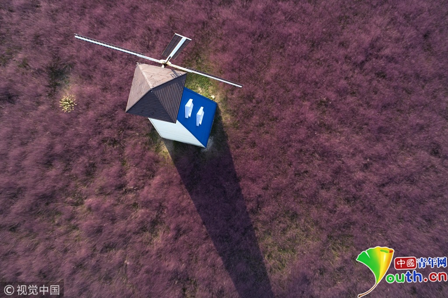 游客在生態(tài)樂園粉黛亂子草中的風車。
