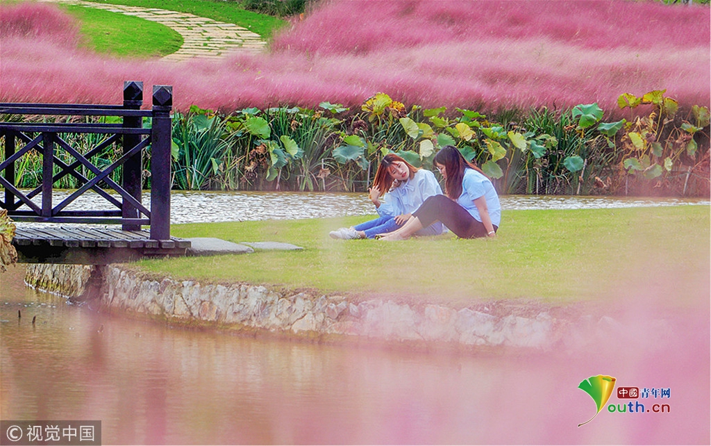 中國青年網(wǎng)北京10月7日電 2018年10月6日,游客在“粉色田野”里游玩、留影。粉黛亂子草是一種觀賞草種,該植物夏季為主要生長季,全株綠色,花期為9月中旬至11月中旬,開花時,綠葉為底,粉紫色花穗如發(fā)絲從基部長出,遠看如紅色云霧。