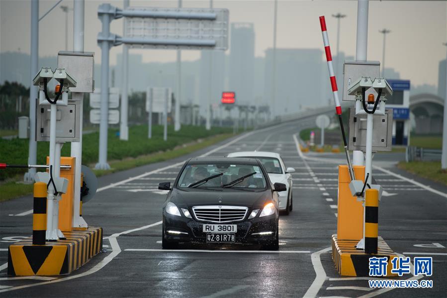10月24日,首輛私家車在澳門口岸離境車道上通關(guān)。當日9時,港珠澳大橋正式通車。 新華社記者張金加攝