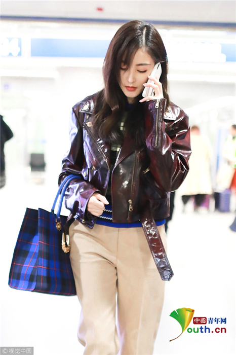 2018年10月25日,北京,張?zhí)鞇?ài)現(xiàn)身機(jī)場(chǎng),她身穿短款漆皮夾克時(shí)尚帥氣,低頭疾走打電話(huà)星范十足。