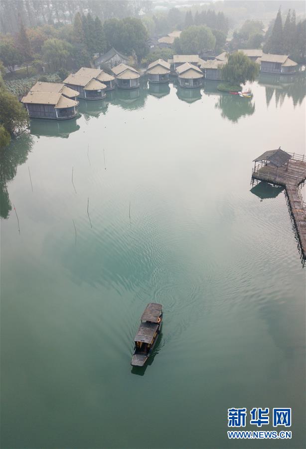10月18日,一艘游船行駛在烏鎮(zhèn)水道上(無人機(jī)拍攝)。新華社記者翁忻旸攝